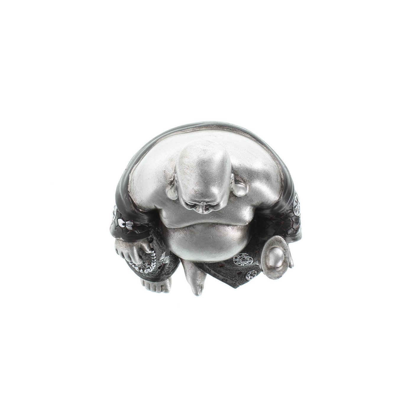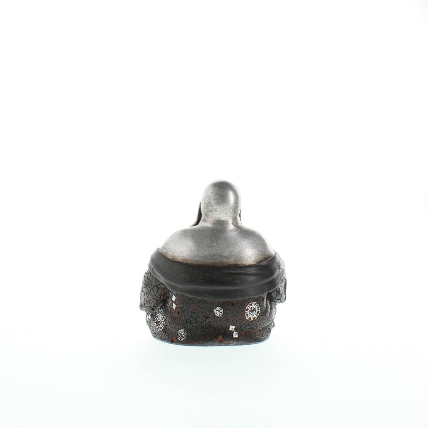 The Happy Buddha's sitting pose and big belly symbolize wealth and prosperity, while his infectious smile exudes happiness and luck. This silver and black statue is sure to inspire positivity in your home.