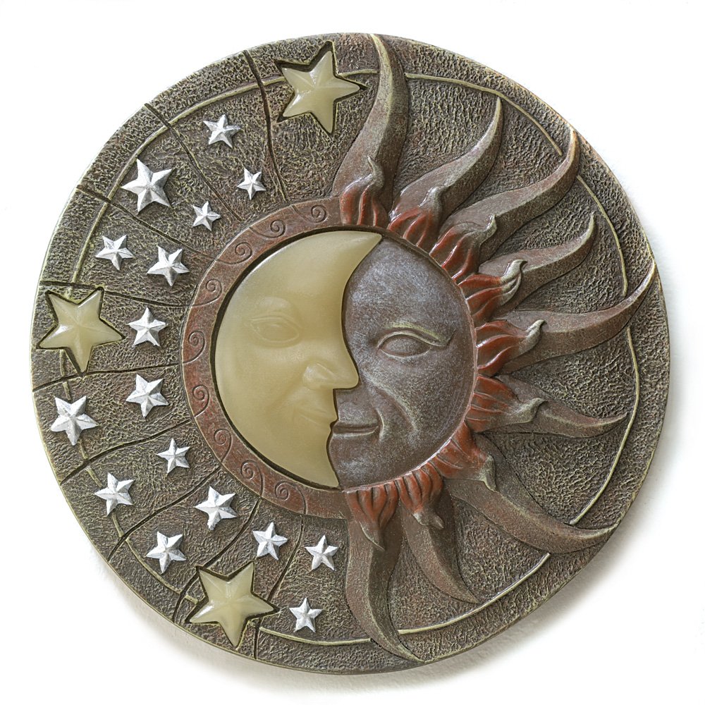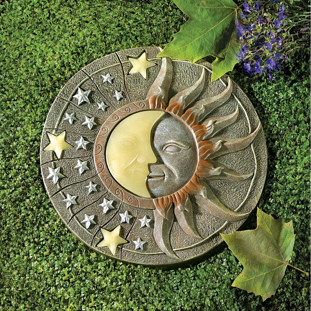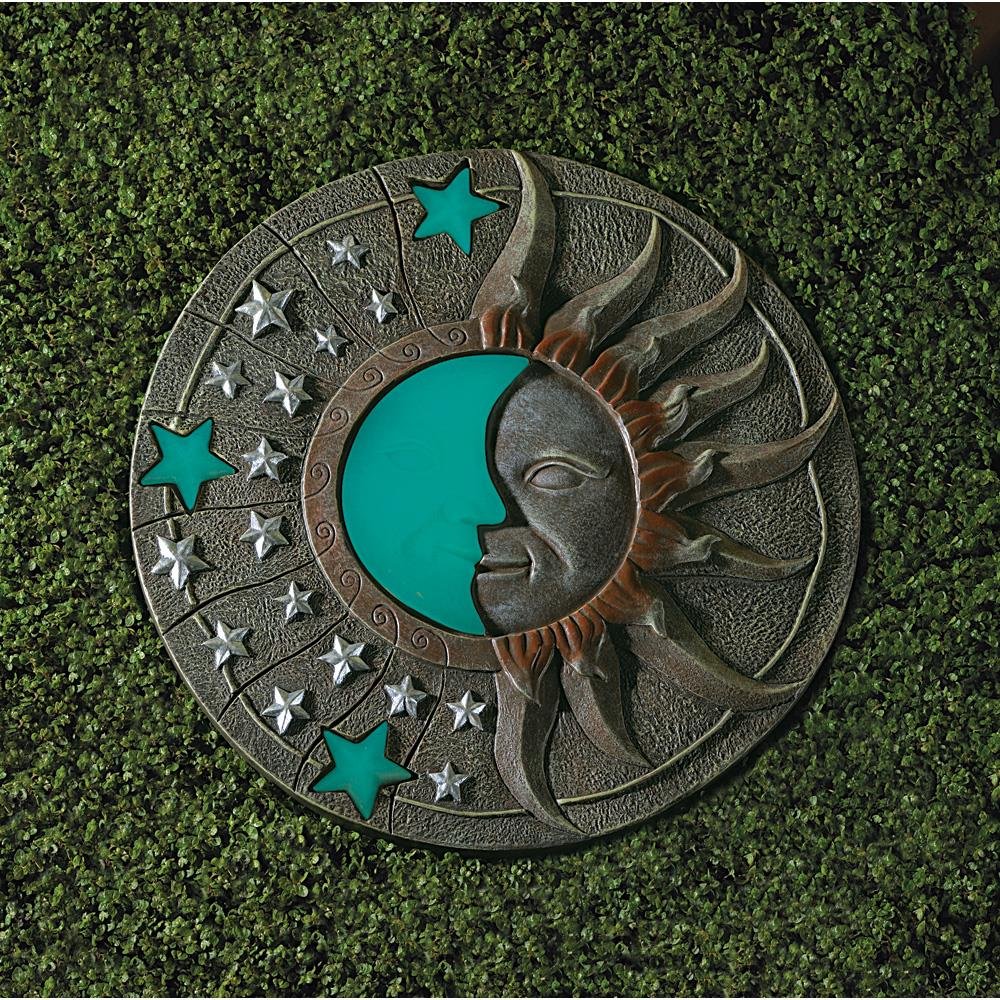 • Lovely by day, and magical by night— place this celestial plaque in a sunny spot to enjoy a beautiful glow-in-the-dark moon and stars image! Stone-look circular plaque makes a beautiful stepping stone. A striking piece of garden art!