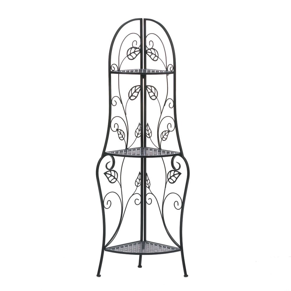 • A sweet treat for any room, this corner baker shelf will display your plants, collectibles and more while enhancing your room with its pretty design. Trellis-inspired shelves climb up the curling metal frame that's decorated with lovely leaves.