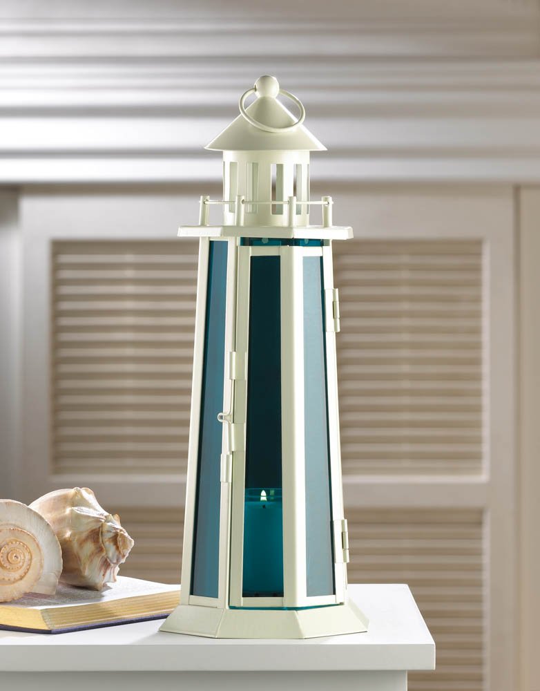 • Style ahoy! This nautical candle lantern will wash your living space with a wave of sea blue glow unlike anything you've ever seen. The brilliant ocean blue glass panels stand tall inside the metal lighthouse frame, ready for the candle of your choice.