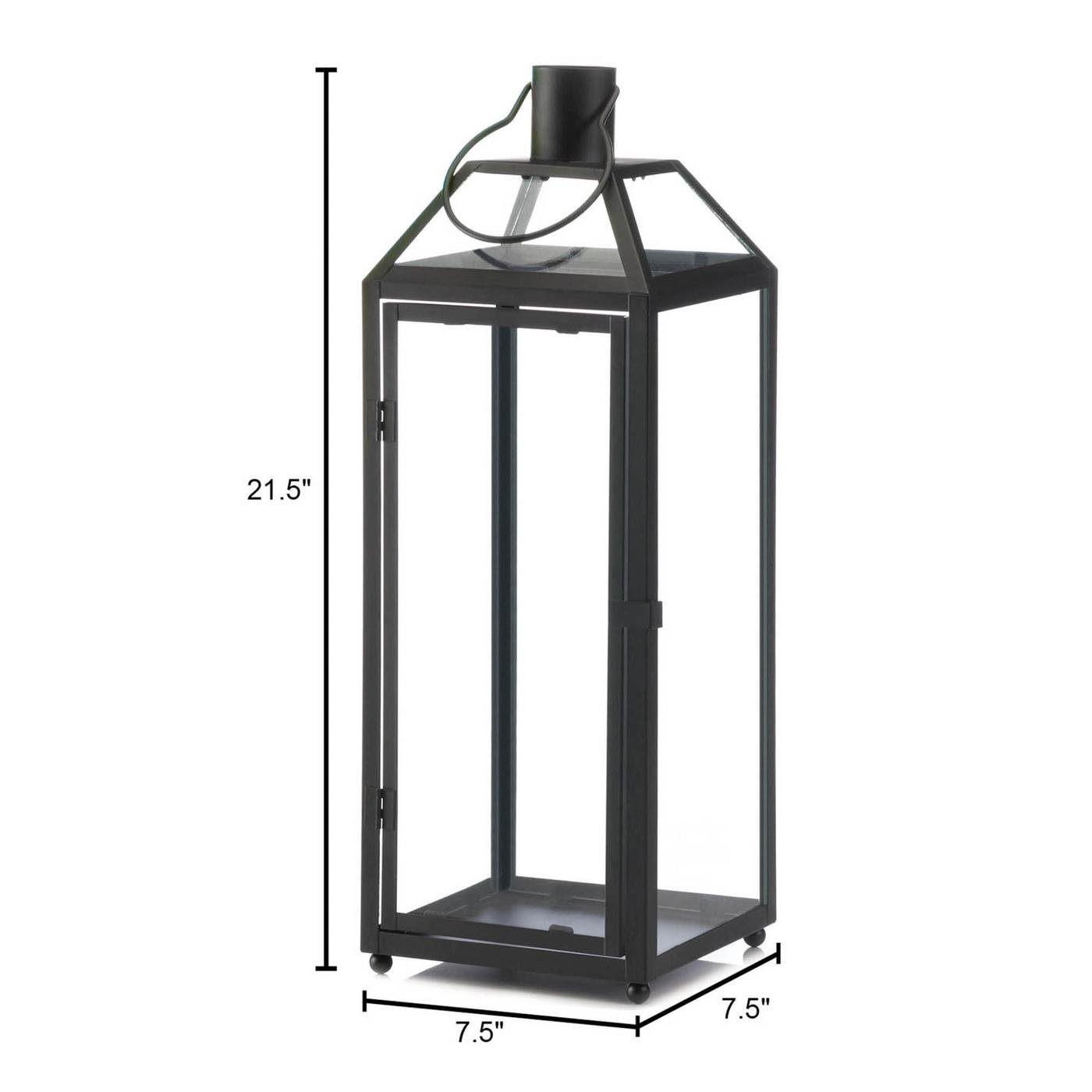 • Take your decor to the height of style with this large black iron candle lantern. Classic lines and clear glass panels make it a surefire way to add timeless chic to your living space. Features top hanging loop and slanted glass roof panels.