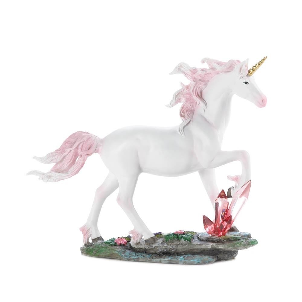 • Enchant your living space with this mythical and magical figurine. A beautiful white unicorn with a golden horn and pink mane and tail strides through a magical land that's filled with crystals and flowers. This mesmerizing décor piece is an excellent gift and will look stunning perched on a shelf, desk, or table.