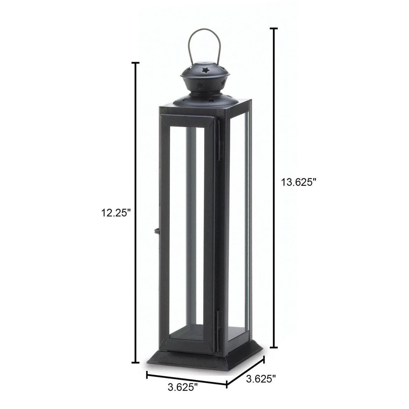 • Standing over a foot high, this incredibly chic candle lantern will be a beacon of amazing style in your living space. The sleek framework is tall and narrow, adding to the drama. Open the hinged door to fill it with a candle. The top features star cutouts and a hanging loop.