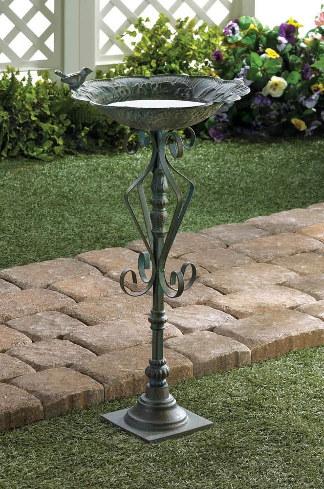 Lovely flourishes and antique green finish of this freestanding bird bath is a charming addition to your garden. Fill it with clean water and watch the thirsty birds stop by. Weight 6.4 pounds. 13.8" x 13.8" x 26.8". Cast Iron. UPC Number: 849179036874.