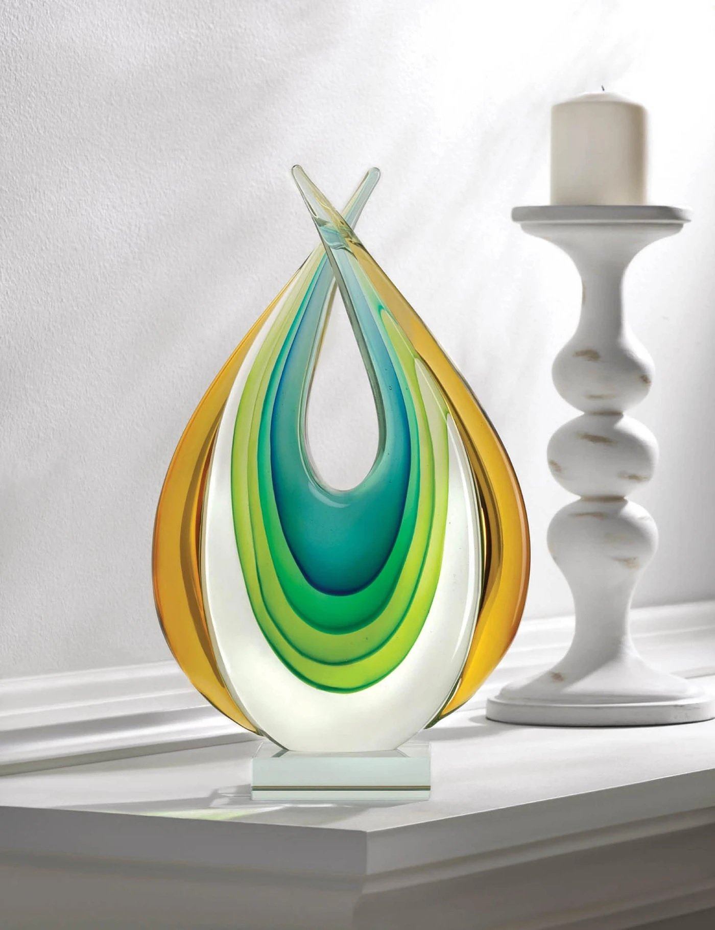 • Modern glass art weighs 4.8 lbs. and measures 7.25 inches by 3.25 inches by 11.25 inches.