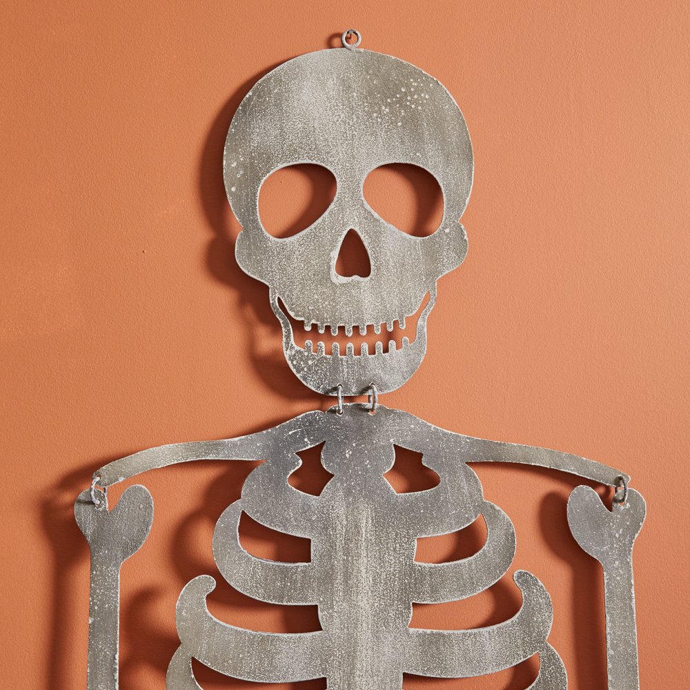 Add a frightening look to your wall with this Hanging Skeleton. It will be a perfect addition to your Halloween party or décor. This item is made of metal and hangs by the loop on its head.