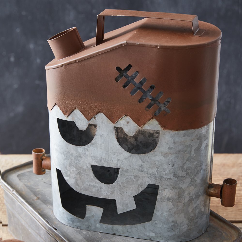 This frightful Frankenstein is sure to be a delight. Illuminate the steps of a porch on a ghoulish Halloween night with our Gas Can Luminary. Simply place a candle inside its hinged door to bring it to life. Item is made of metal.