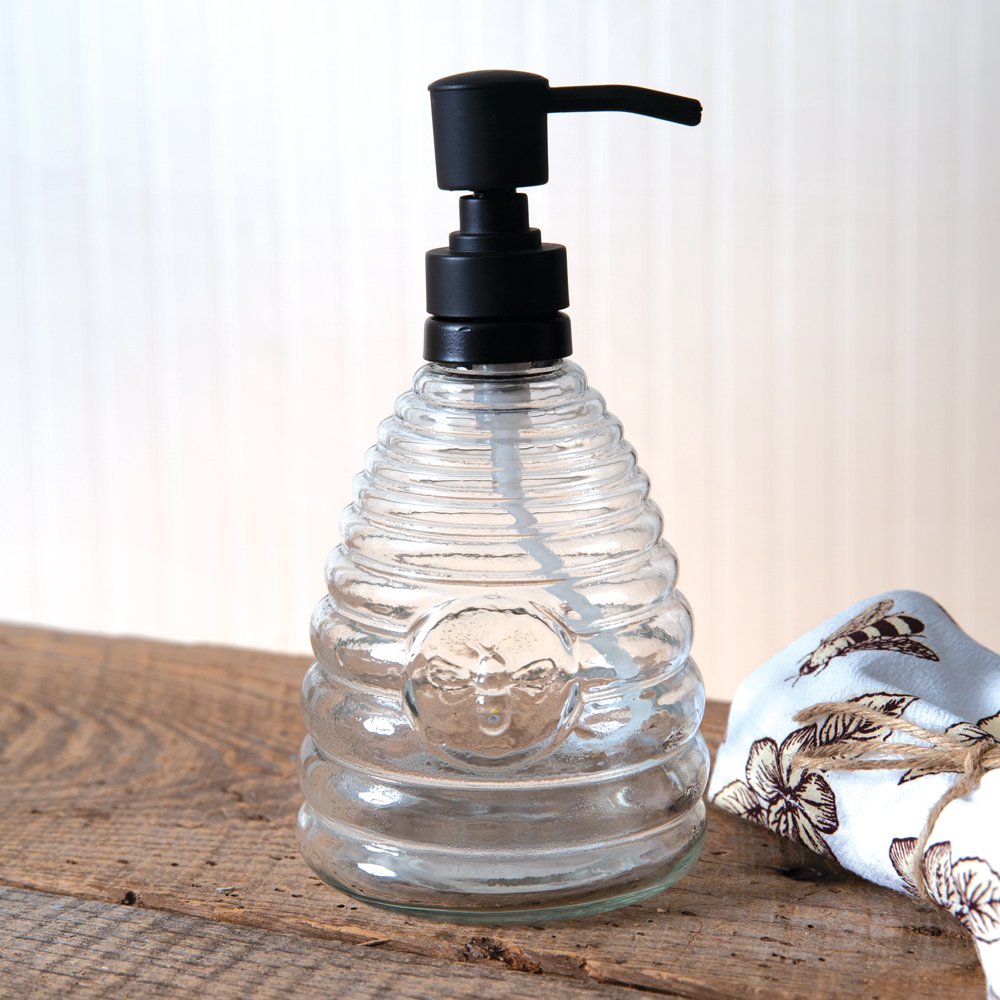 Have your guests buzzing about your bathroom or kitchen! This pumper features durable glass shaped in a beehive with a bee in its center. Pumper is finished in matte black. Dispenser holds 18 ounces of liquid.