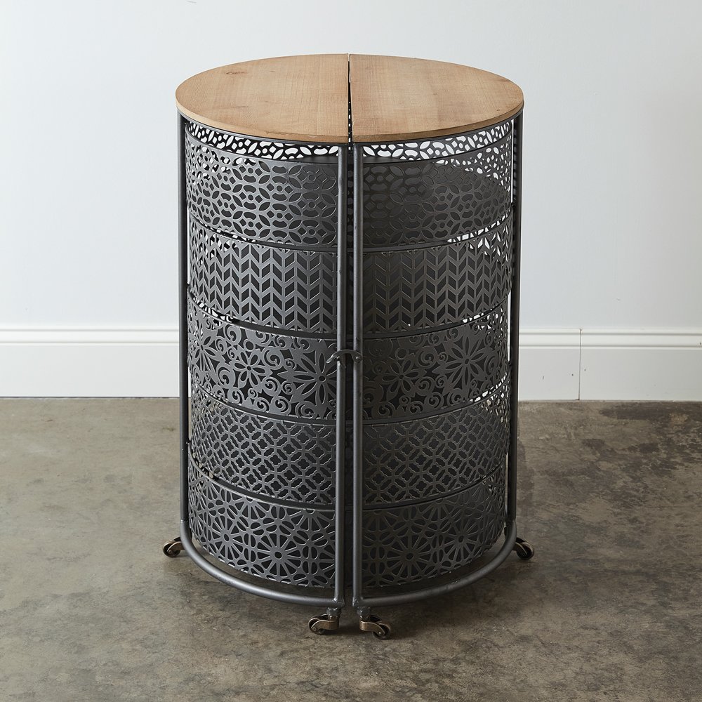 Metal Expandable Storage has so many uses! Item is made out of metal and wood and has alternating cutout designs for each bin. It opens to 36½''W and sits on castors for ease of use. Bins measure 5''H and 10'' apart from bottom to bottom.