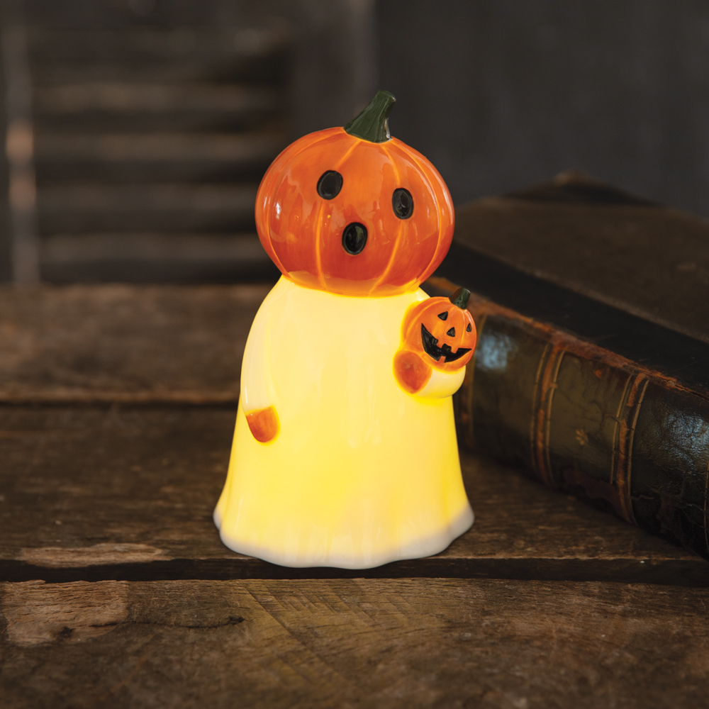 Caught in a moment of delightful shock, our Surprised Pumpkin Ghost wears an expression that'll tickle your funny bone and send shivers down your spine. Its wide-eyed, open-mouthed astonishment is charming and its ghostly figure glows – a perfect mix for Halloween thrills! This item is crafted from ceramic and includes three LR44 batteries.